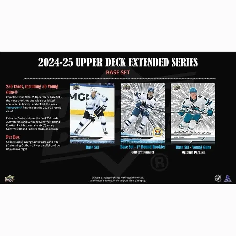 Extended Series delivers the final 250 cards: 200 veterans and 50 Young Guns/1st Round Rookies (2024-25 rookies that were first round selections). Each box contains six Young Guns/1st Round Rookies cards, on average.