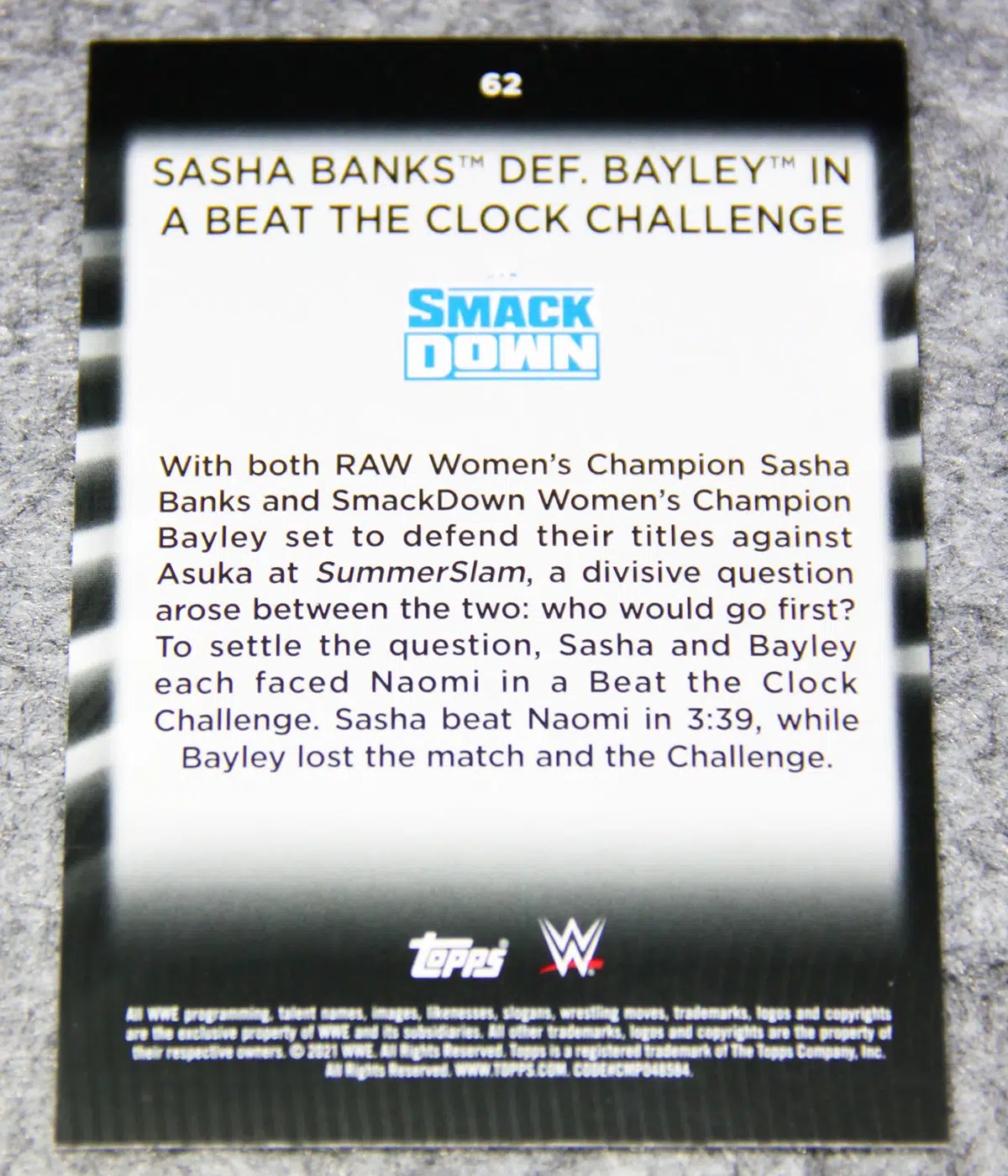 - Set: WWE Smack Down Sasha Banks def. Bayley in a Beat the Clock Challenge