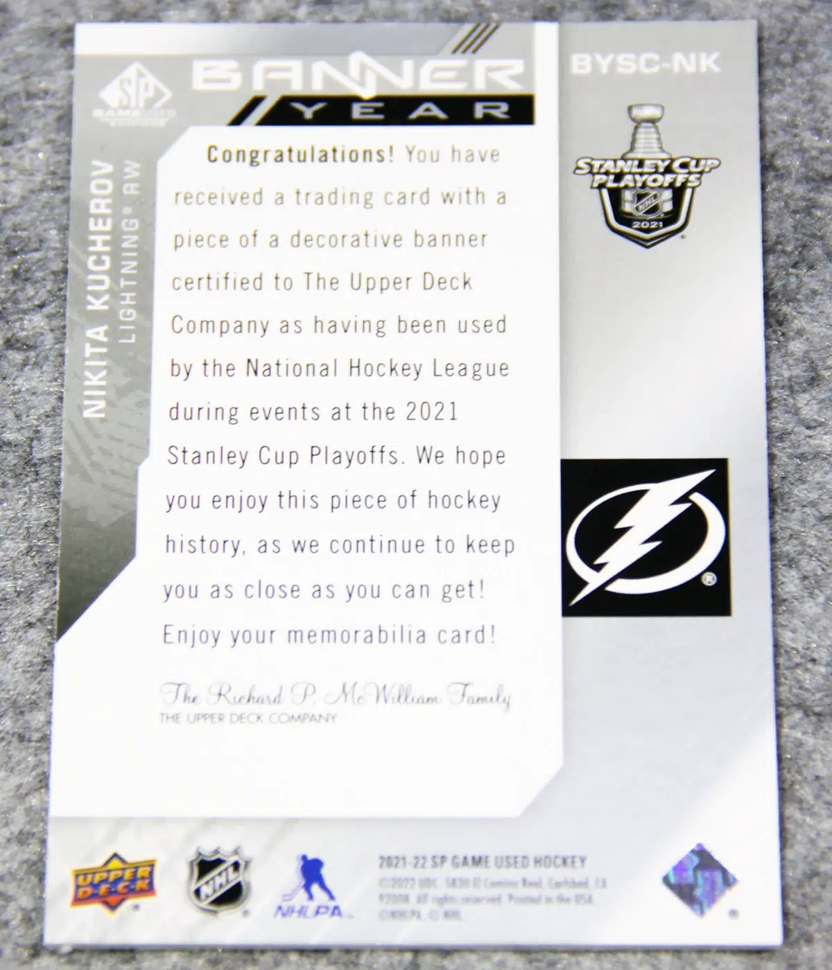 2021-22 Nikita Kucherov #BYSC-NK Upper Deck SP Game Used Banner Year Stanley Cup